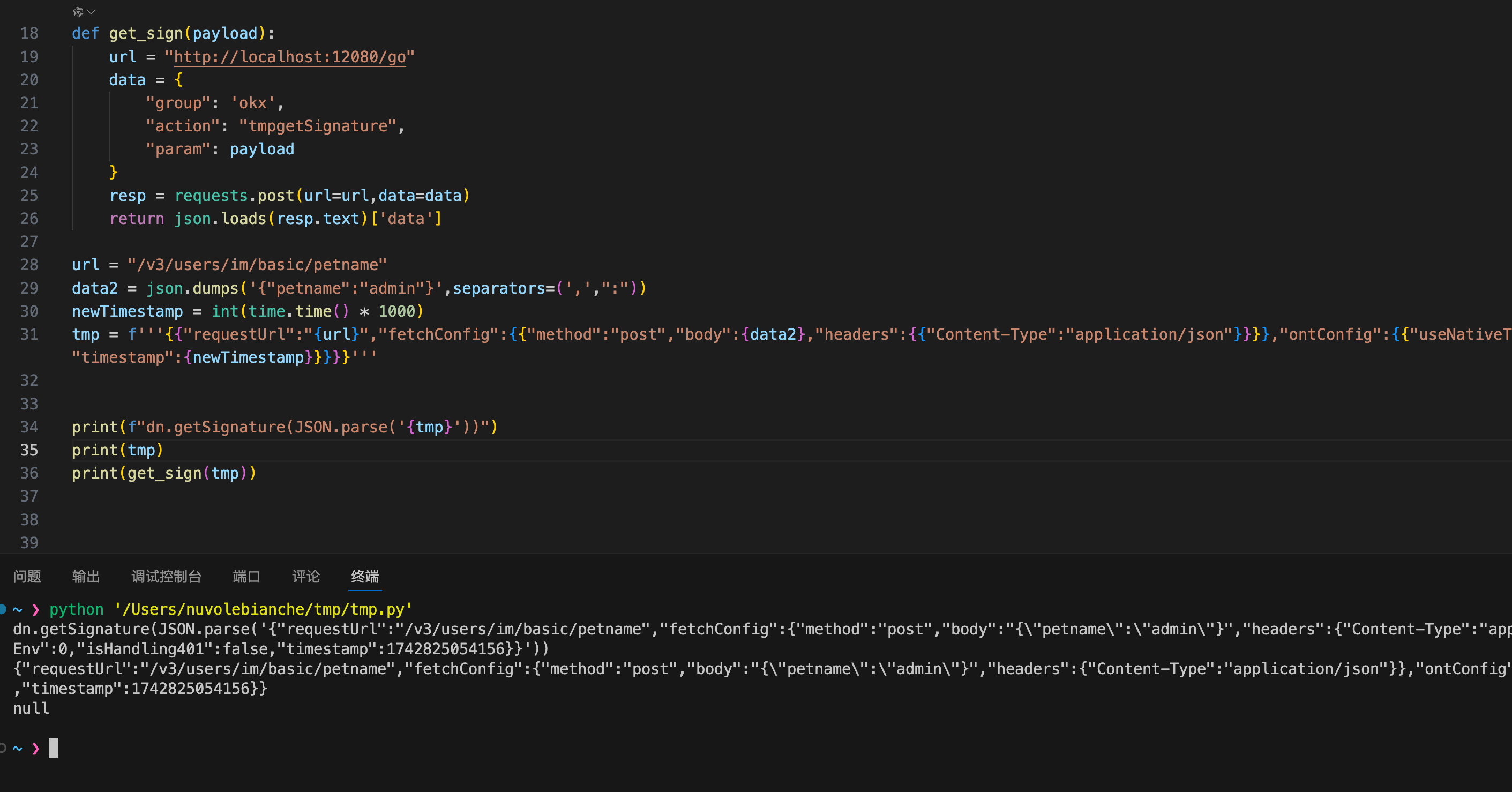 所以在python脚本中,只需要修改requestUrl的值、body的内容以及timestamp就行,大致代码如下: